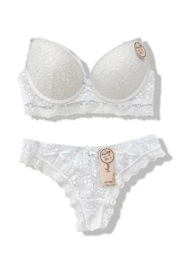 Entdecken Sie unser Dessous-Set aus Spitze, das einen gepolsterten BH mit Bügel für einen leichten Push-up-Effekt und ein passendes